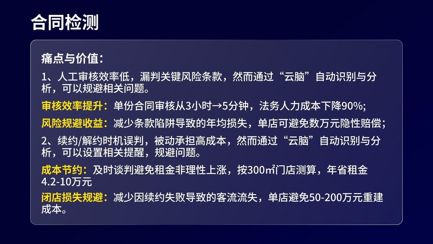 AI驱动的自动化运营管理: 部署自研AI产品,智能管理员工健康证,自动识别证件信息、精准追踪有效期,临近过期自动预警,确保合规零风险;同时智能化管理供应商合同、租赁合同等,关键条款自动提取、到期提醒、快速检索,大幅提升后台管理效率与安全性。