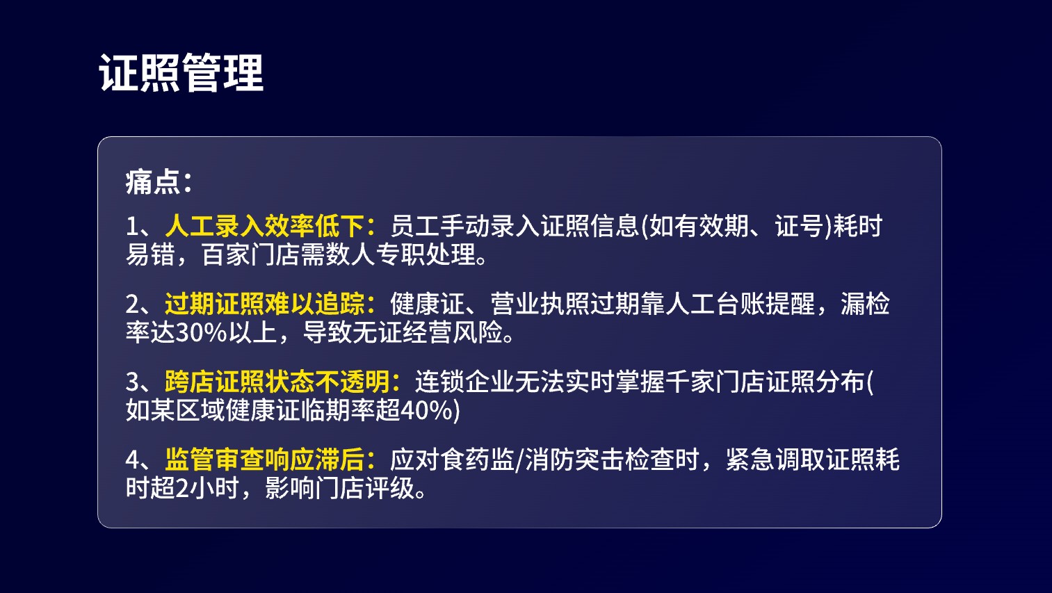 痛点: 作为技术试验场,门店需处理大量基础运营事务(如员工健康证有效期追踪、各类合同管理)及高频次市场洞察(竞品动态、日经营复盘),传统人工方式效率低下、易出错且难以形成结构化洞察,消耗管理精力,影响核心测试目标的效率。