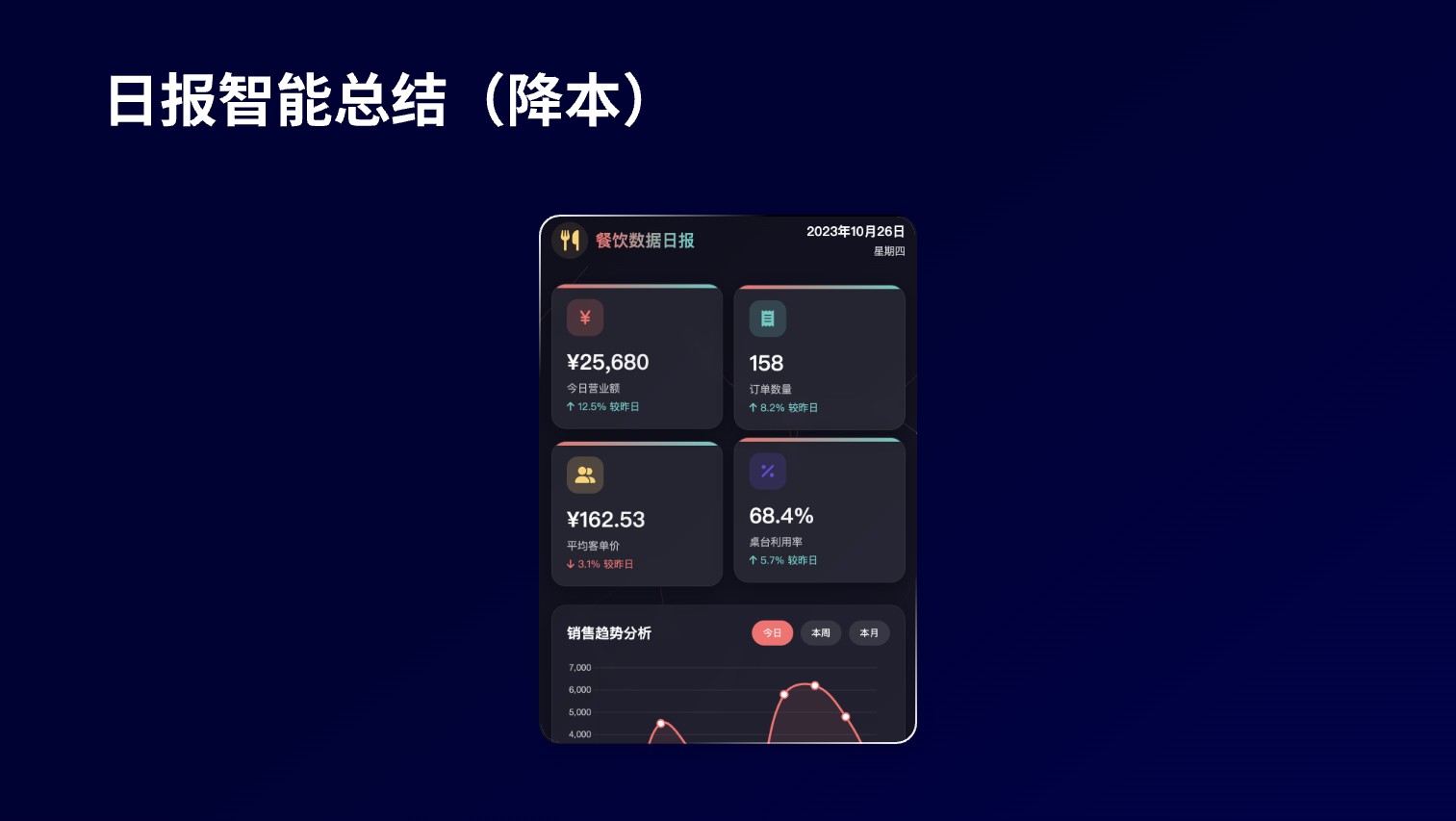AI赋能的市场洞察与经营分析: 利用AI能力,自动生成竞品分析报告,实时抓取、分析周边竞品菜单、定价、促销活动及线上评价,提炼核心趋势与优劣势,为运营策略调整提供即时数据支撑;同时自动生成精细化每日经营日报,整合销售数据、客流分析、畅销/滞销品信息、异常波动预警等关键指标,为店长及总部提供一目了然的经营复盘与决策依据。